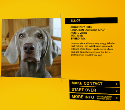 Muchas veces hemos oído que los perros se parecen a sus dueños, y basándose en esta afirmación han creado esta aplicación donde el visitante puede subir una foto al servidor (o hacerse una con su webcam) y el programa analiza sus rasgos faciales. Después del análisis, los pone en común con una base de datos llena de fotografías de perros. Y una vez encontrado el perro que más se parece al usuario, se establece la opción de adoptarlo o ponerse en contacto con el responsable de la adopción.