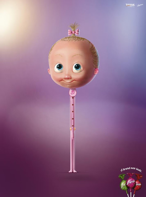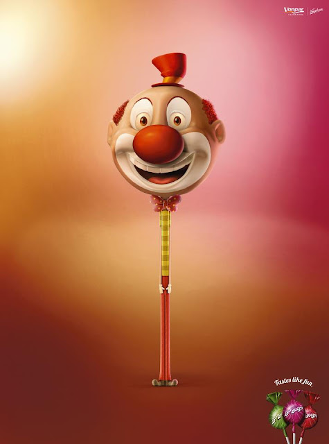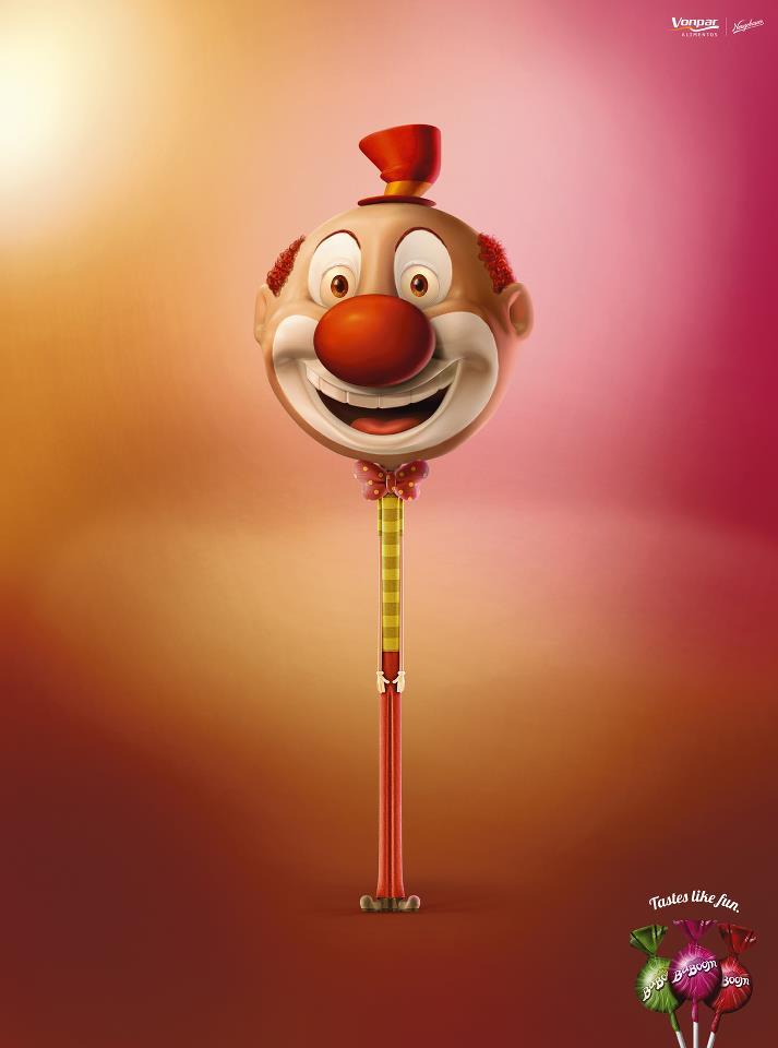 Lo que más me agrada de la campaña son dos aspectos. En primer lugar, el hecho de que podemos ver que se ha personificado un objeto inanimado como es la golosina en diferentes personajes muy relacionados con el mundo de la infancia (un payaso, un alien y un bebé). Y por último, el acabado tan mágico y especial de las ilustraciones. Los colores se funden para dar lugar a un detalle muy logrado, donde te apetece probar el producto a pesar de la irrealidad de la imagen. Una maravilla, ¿verdad?