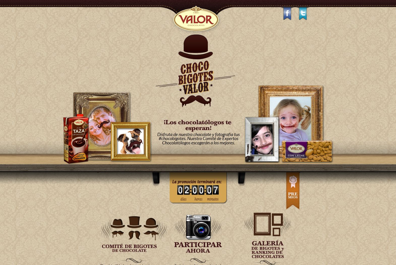 Se trata de un concurso que se está llevando a cabo en Facebook, Twitter e Instagram donde se buscan los mejores bigotes de chocolate. Para tal fin, los usuarios tienen que subir una foto suya, con su propia versión de chocobigote, a cualquiera de las tres redes sociales. Una vez hecho esto, un grupo de expertos en este gran arte escogerá, cada 15 días, las mejores imágenes (hasta el 30 de enero). El ganador se lleva un superlote de productos de Chocolates Valor (¡Qué rico!)