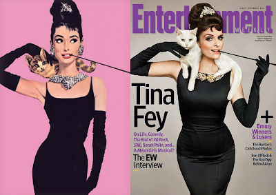 | Comparación de una ilustración de Audrey Hepburn y una portada de Entertainment con Tina Fey |