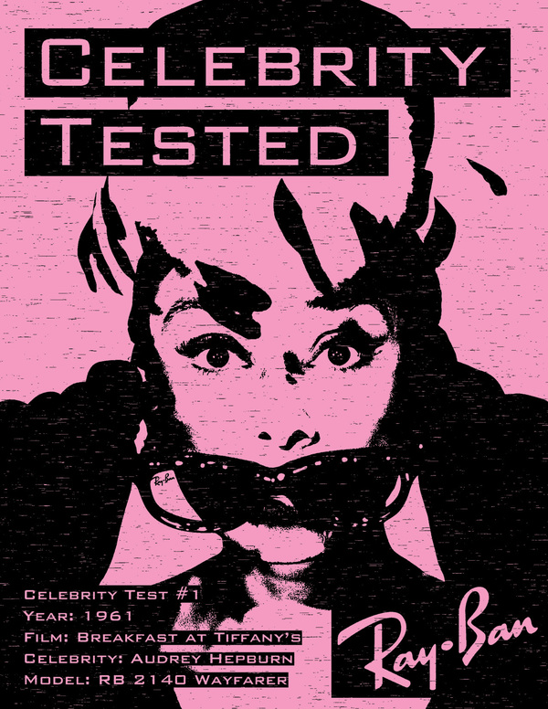 | Gráfica de Rayban que dice que el primer test de las gafas a Celebrities fue en la película «Desayuno con Diamantes» |