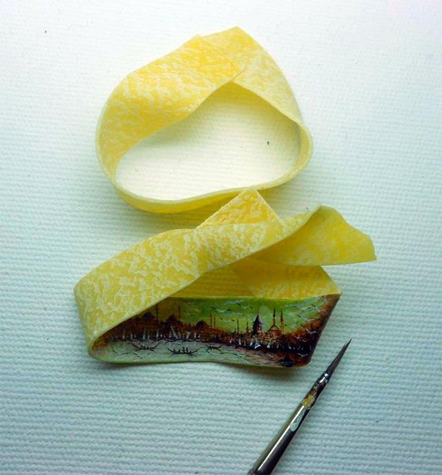 Hay gente que tiene talentos increíbles. Uno de estos casos es del artista Hasan Kale, que realiza pinturas de un tamaño diminuto. Su lienzo puede ser la piel de un limón, una cáscara de un fruto seco, o el interior de un reloj de pulsera. Este artista truco incluso utiliza las partes de insectos disecados para sus obras de arte.