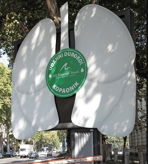 Un concepto relativamente nuevo en marketing de guerrilla es lo que hemos bautizado «marketing reivindicativo de marca«. Se trata de un tipo de marketing, cuyas acciones se desarrollan bajo un paraguas de reinvindicación pero cuyo objetivo no es llevar el mensaje a la reivindicación y concienciación social, sino que su fin es vender una marca determinada. Para explicarnos mejor, son aquellas campañas que aprovechan causas de denuncia social para vender su producto o servicio. Un ejemplo es el del resort hotelero ubicado en la montaña. Se trata del MK Mountain Resort Kopaonik. Esta empresa, era consciente de que iban muchos turistas a Belgrado en temporada alta. Para promocionar su marca y conducir a los mismos hasta sus instalaciones realizaron una acción de street marketing. Ésta consistía en instalar unos pulmones gigantes de algodón. Durante el transcurso de 10 días, los pulmones se pondrían grises, demostrándose de una manera visual, los elevados niveles de contaminación que presenta la ciudad. Estos pulmones grises serían, por tanto, los encargados de comunicar este mensaje: «vete de la ciudad y disfruta de la naturaleza en nuestro resort».