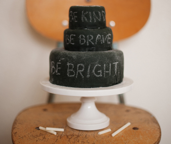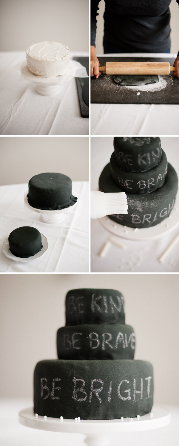 Esta tarta está cubierta con una textura que imita a una pizarra, gracias a la combinación del fondant negro con el azúcar pulverizado o granulado. Y las tizas, son en realidad caramelos de color blanco.