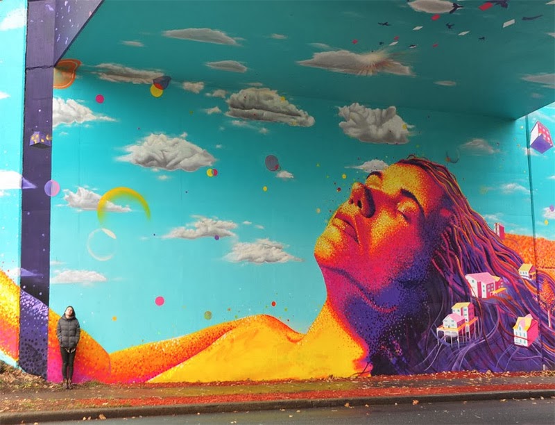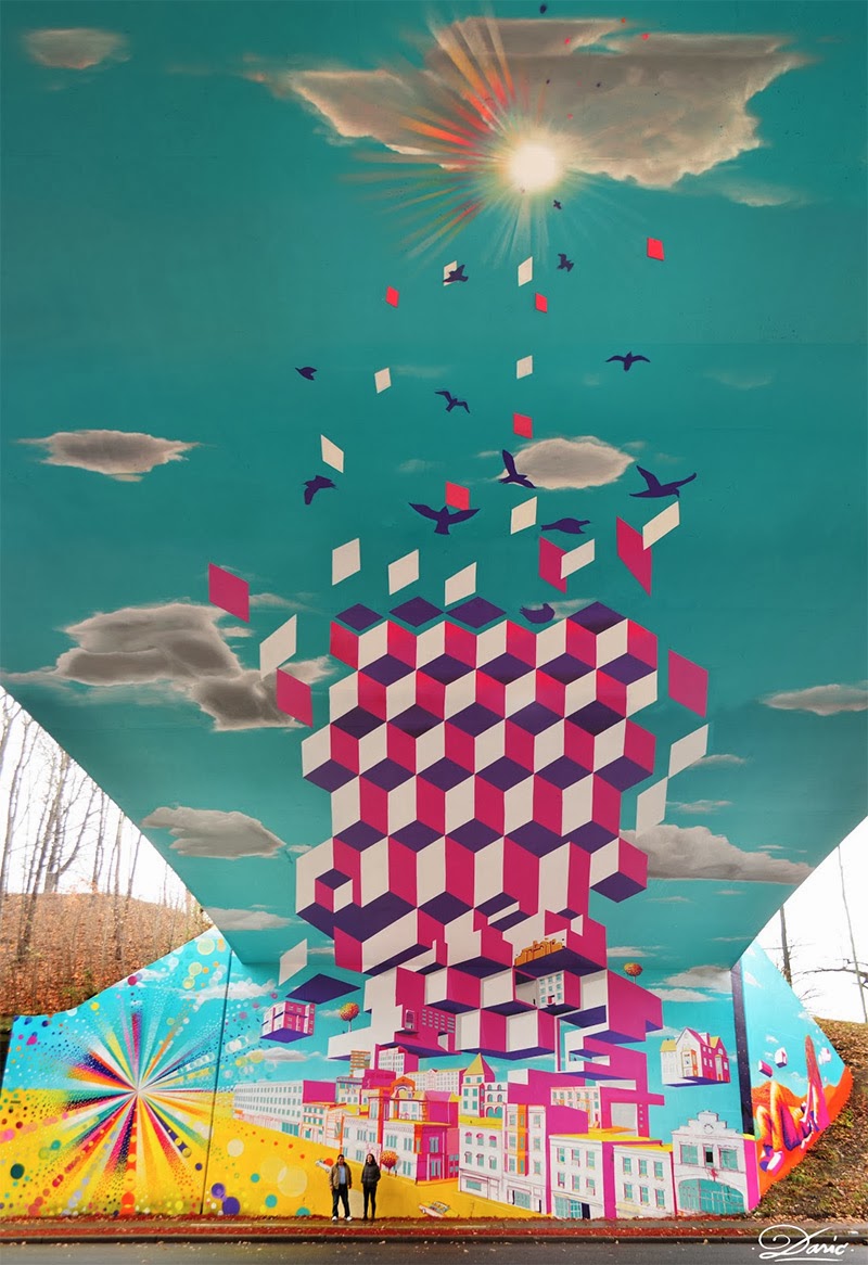 De todos sus trabajos, destacamos sus murales gigantes que incluyen efectos ópticos. El artista juega con la profundidad de campo, los colores y también con el espacio que dispone para crear rincones imposibles, surrealistas y llenos de contrastes.