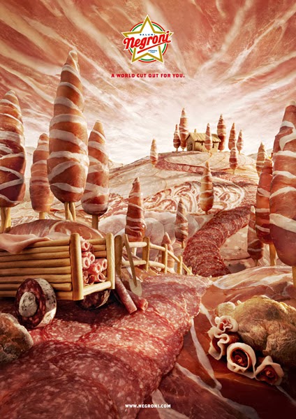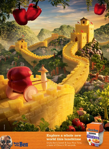 Pero no sólo se dedica a realizar paisajes artísticos, también se ha dedicado a realizar spots de televisión y anuncios gráficos con su arte. Sobretodo, ha sido relacionado con el sector de la comida y bebidas, lo cual es lógico, ya que mayormente ha realizado paisajes de comida. Aun así, debemos destacar que ha llevado a cabo otros tipos de paisajes hechos con telas u otros elementos, como este anuncio que vemos a continuación.