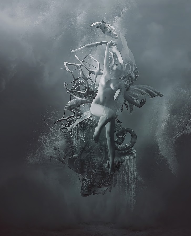 Pero no sólo nos detenemos en el aspecto gráfico de la imagen. El significado también halla la suavidad de la que hablamos. La obra de Van Ray incluye elementos surrealistas donde el concepto de «volar» está presente. Donde los personajes principales fluyen, flotan o emergen. Donde los elementos naturales como la tierra, el agua o el aire son los que nos hacen sentir gozo al ver semejante belleza surrealista.